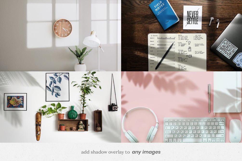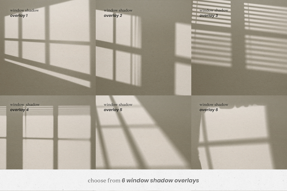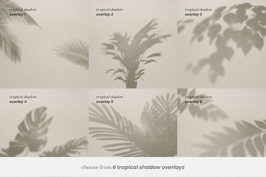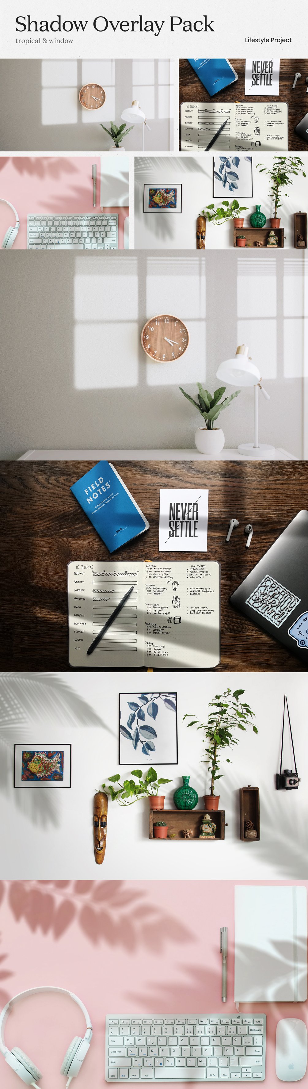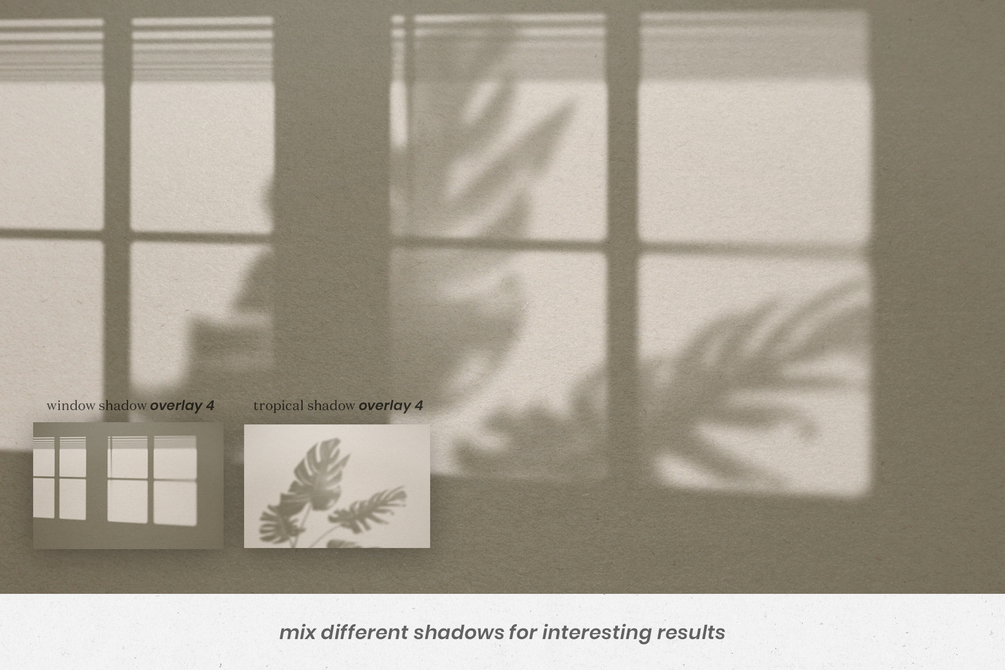 Our first collection of shadow overlay pack is here. This contains realistic tropical (think leaves, plants, trees) and different window shape shadows. If you want to add extra depth and authentic feel to your mockups instantly, this pack is for you.